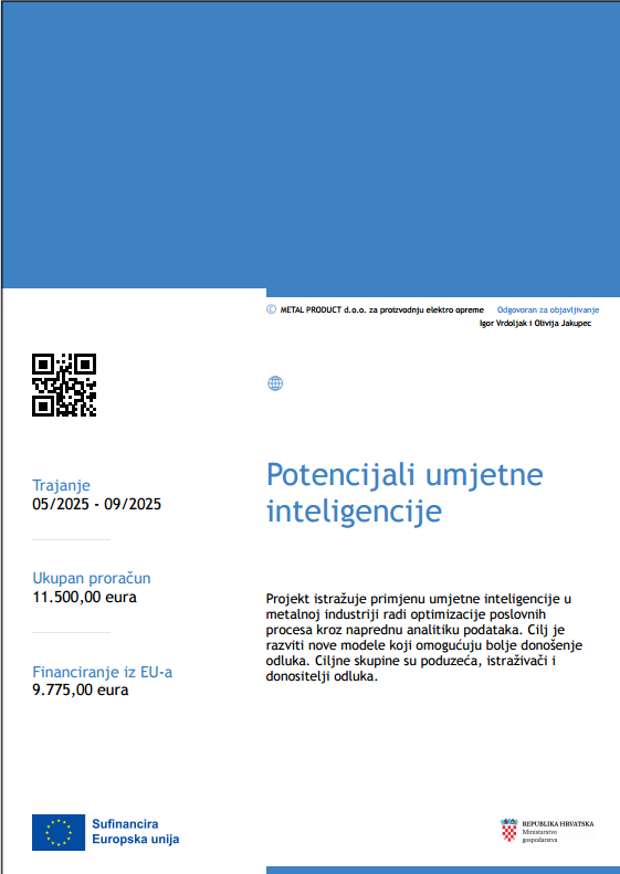 Projekt istražuje primjenu umjetne inteligencije u analitici podataka u metalnoj industriji s ciljem razvoja naprednih modela koji omogućuju dublje uvide i bolje poslovne odluke. Ciljne skupine su poduzeća, istraživači UI i donositelji odluka zainteresirani za povećanje produktivnosti i optimizaciju resursa.